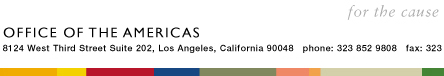 center- Los Angeles Los Angeles Alliance for a New Economy (LAANE) An alliance including: Neighbors for Peace and Justice This neighborhood organization was formed in Los Angeles in response to the events of September 11. Members of their community gathered to discuss alternative approaches to the government's declaration of war on terrorism. They wanted to educate ourselves and to influence the direction of our country's foreign and domestic policy. They are concerned about the violence against civilians caused by war as well as its negative effects here at home on the economy, civil liberties and social services. More Information... The Office of the Americas is a non-profit organization dedicated to furthering the cause of justice and peace in the hemisphere through broad based educational programs. Founded in 1983 in Los Angeles, OOA is a recognized source for documentation and analysis of current events in North America, Mexico, Central America, and South America, including the War on Drugs, human rights, and United States foreign policy. The Office is often called upon to present expert testimony in litigation before the Federal Immigration Court. Office of The Americas 8124 West Third Street Suite 202 Los Angeles, California 90048 323/852-9808 FAX 323/852-0655 EMAIL OOA@igc.org WEB http://www.officeoftheamericas.org/ Site donated and developed by Ocean Park Software. - revised 17:09:56 PDT - |