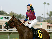 Michael Baze and Knockout Artist get thumbs up for an Oceanside Stakes win.