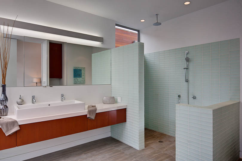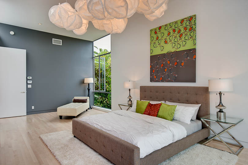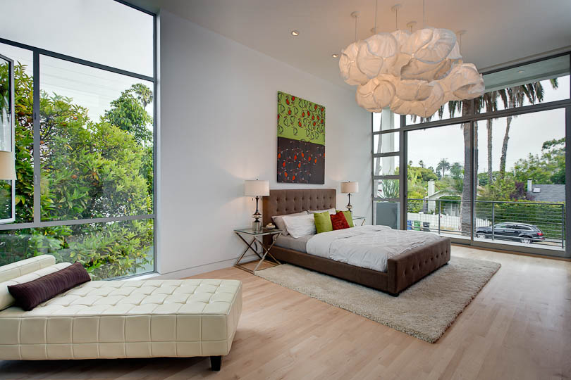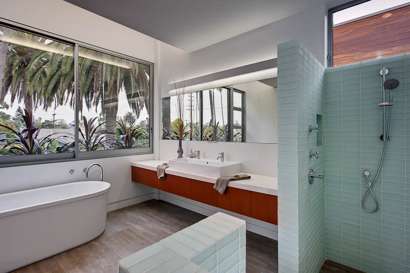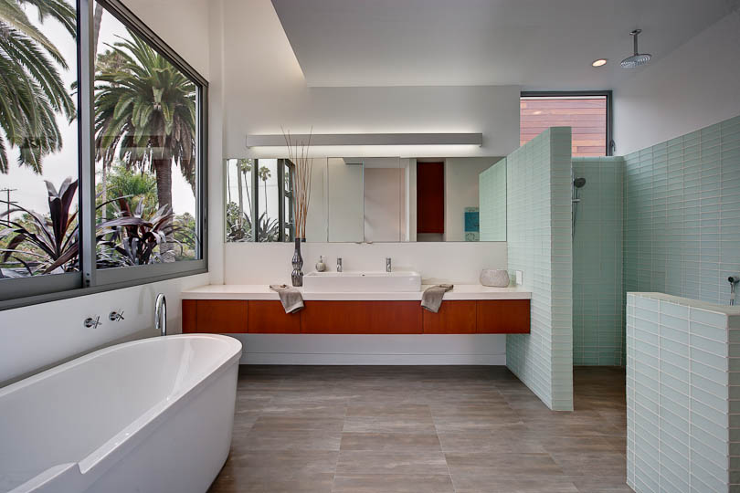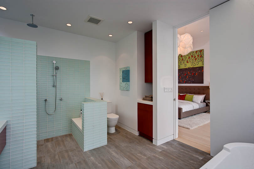 Gehry Cloud Lights, a sleek master bathroom, and commodious master