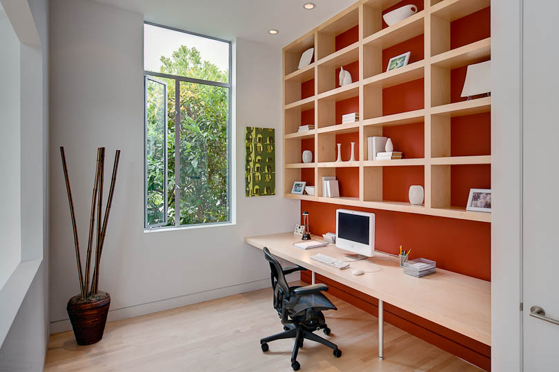 a dramatic loft-like office overlooking the dining room and